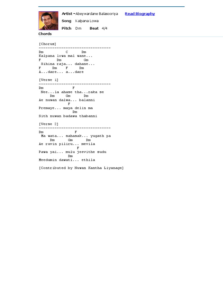 Bhawayen Bhawe Doc Artis Abeywardane Balasooriya T Song Kalpana Lowa Pitch Dm Bea T 4 4 Chords Chorus Dm C Dm Kalpana Lowa Mal Wane F Dm Gm Sihina Course Hero - e d g em bm a b ebm am eb dbm bb ➧ chords for adara hangum w d amaradewa with capo transposer, play along with guitar, piano, ukulele & mandolin.